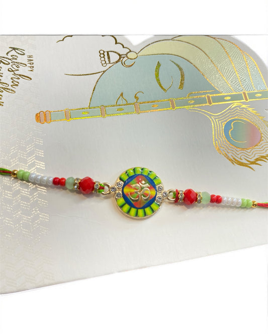 OM Charm Rakhi 2025 – Yellow/White, Green/White, Red/White – Style Code 1508
