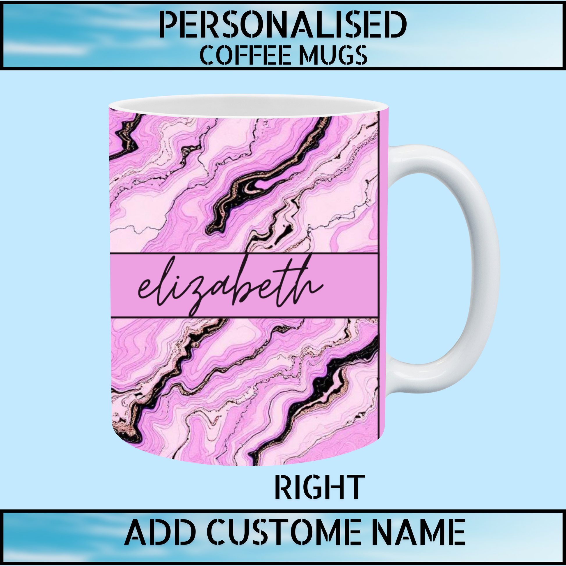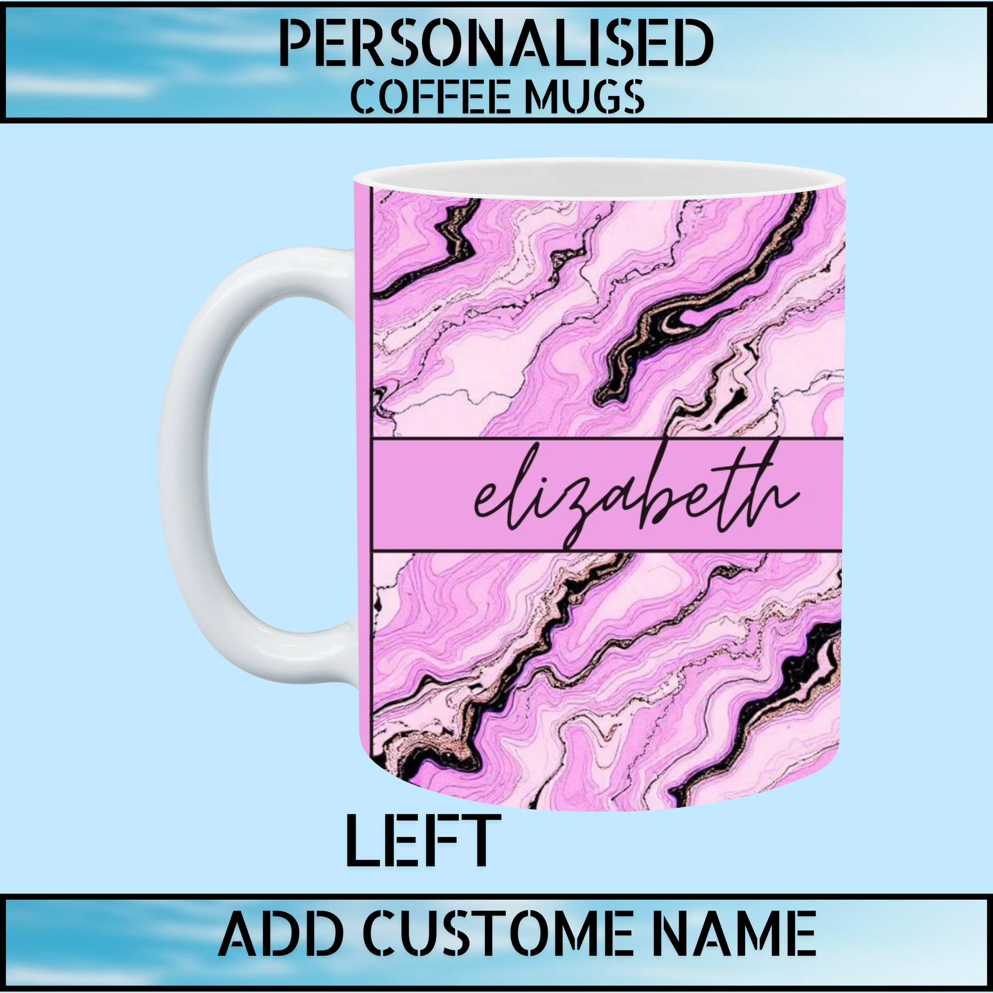 The mug features a soft pink marble-effect design on both the left and right sides, each side finished with a clean personalised name box where the buyer’s name is printed clearly.