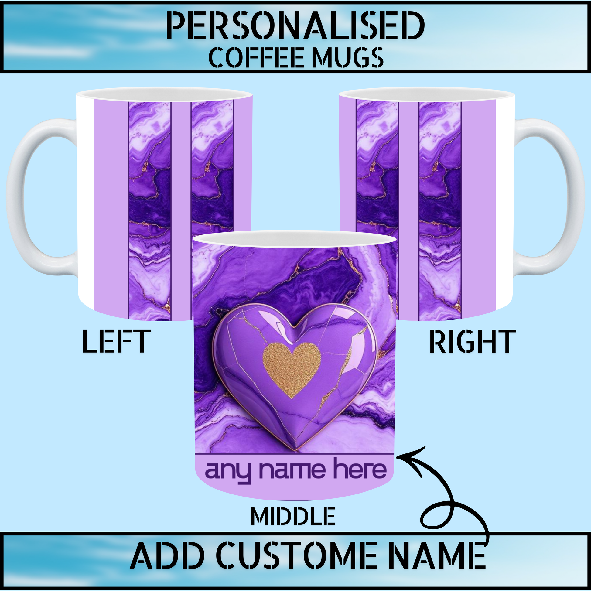 The centre of the mug features a purple marble background, highlighted with a heart-shaped marble effect design that blends seamlessly into the surface. Just below the heart, a plain personalised name box allows the buyer’s name to be added for a clean and modern finish.