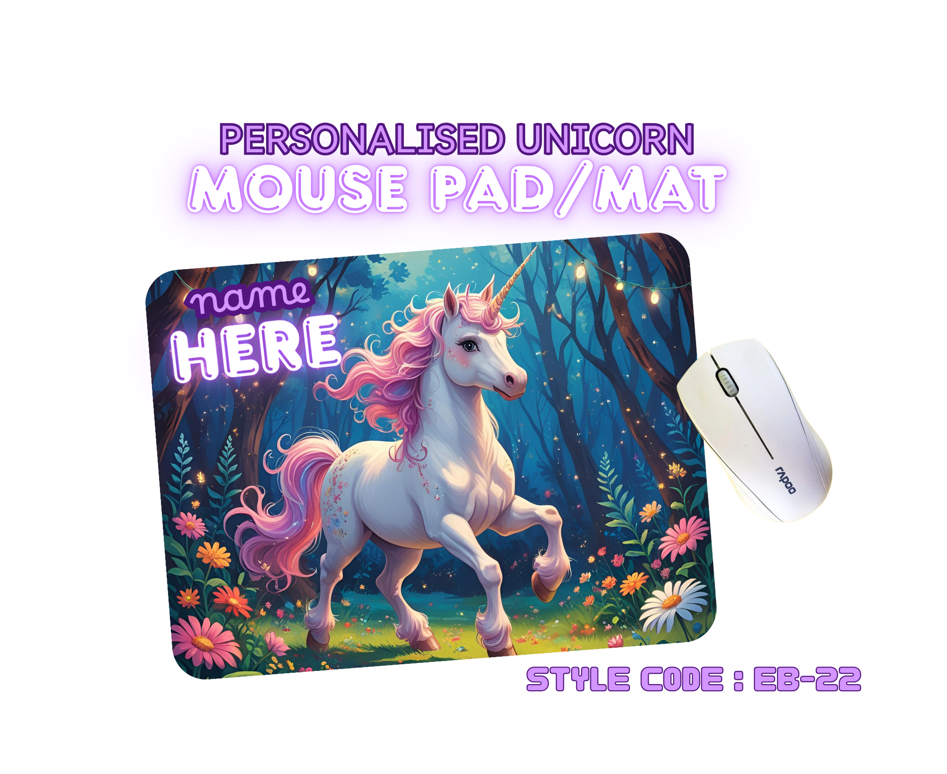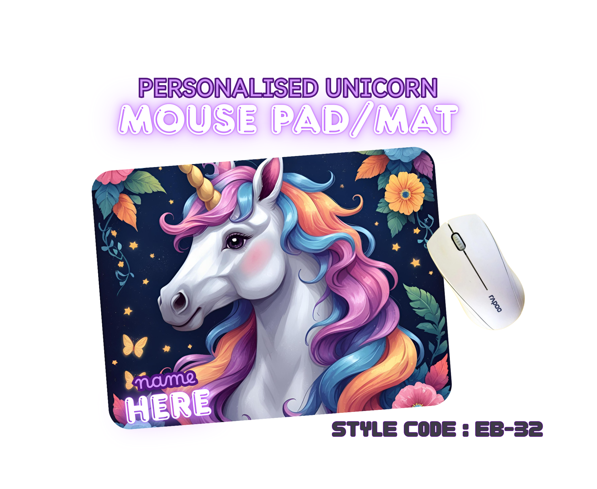 Personalised Unicorn Mouse Mat | Pad | Custom Name Print | EB22–EB32 Designs