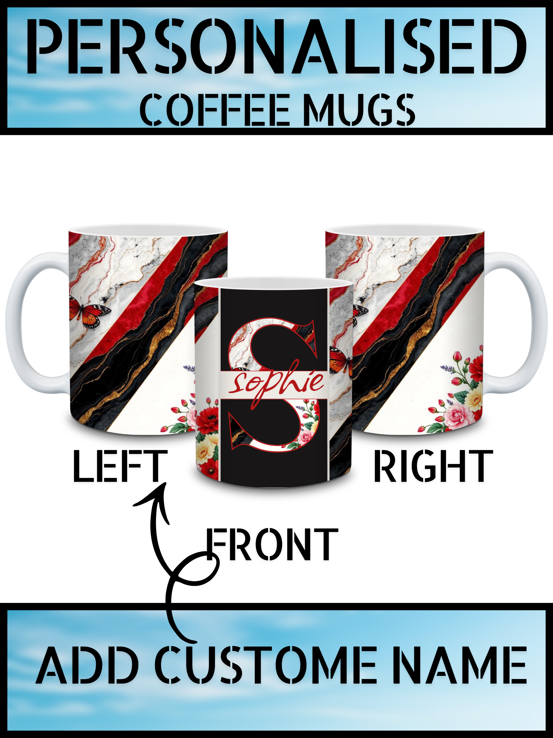The centre of the mug remains clean and refined, with a plain background matched to the red and black colour palette, beautifully highlighting the personalised initial and buyer’s name.