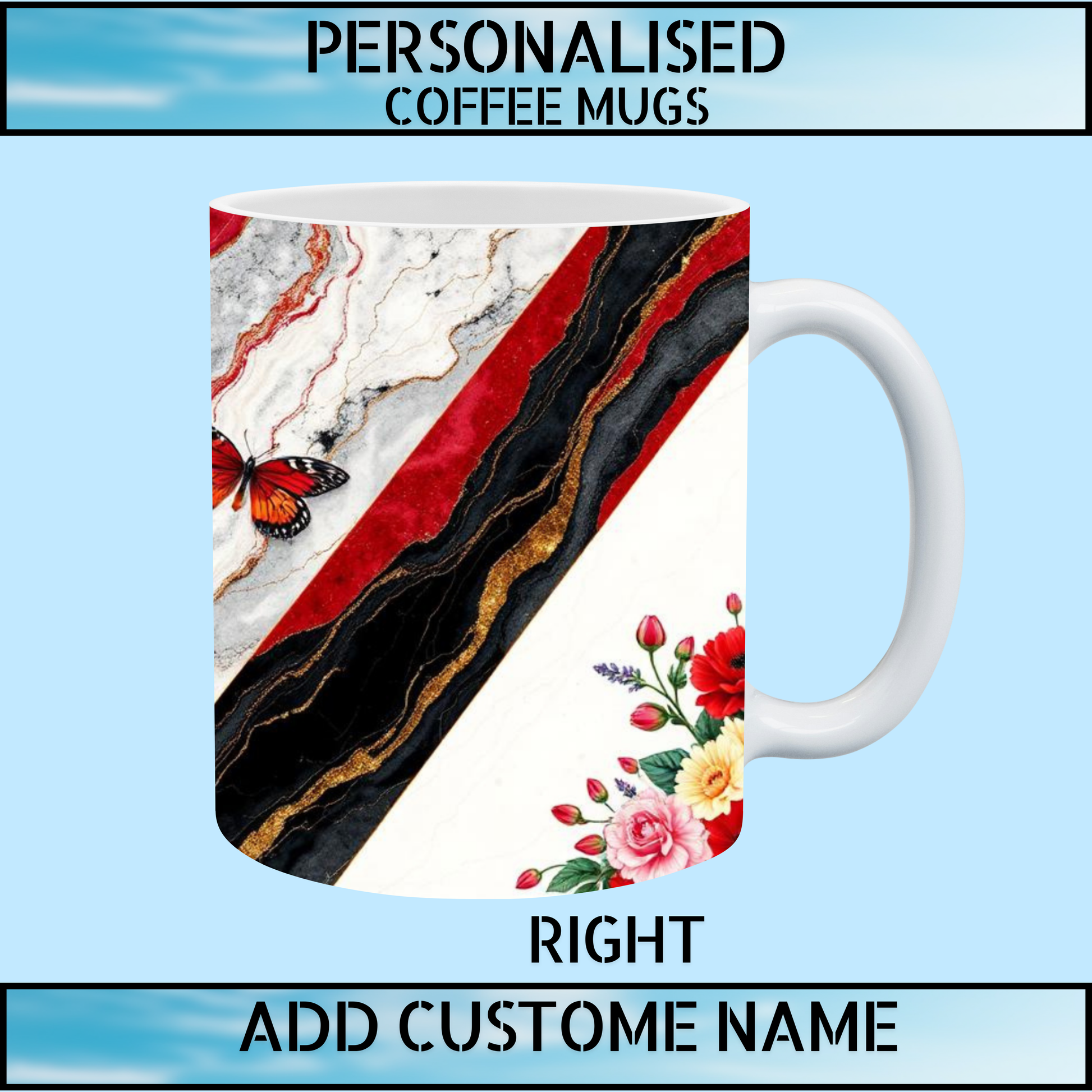 Both the left and right sides of the mug feature a split design, with deep red and black marble art on the upper half and coordinated floral artwork on the lower half, creating a modern, eye-catching finish.