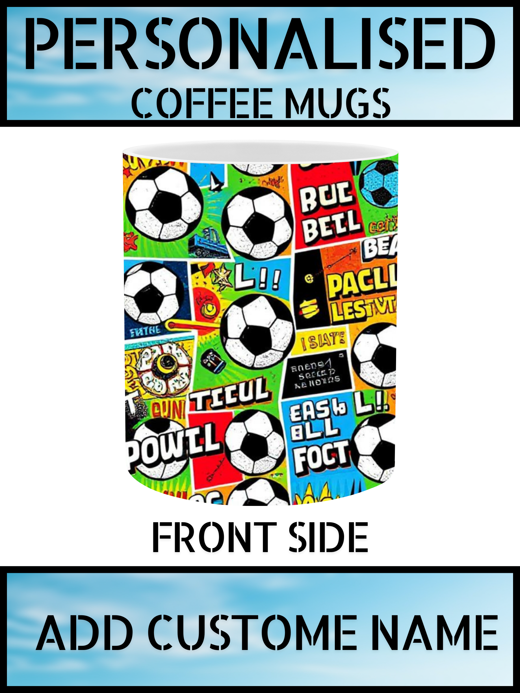 Bring excitement to every coffee break with our white ceramic coffee mugs featuring personalised name prints and unique football designs. Each 11oz ceramic mug is printed in the UK using vibrant dye sublimation by NKB, ensuring colours that last without fading or peeling.